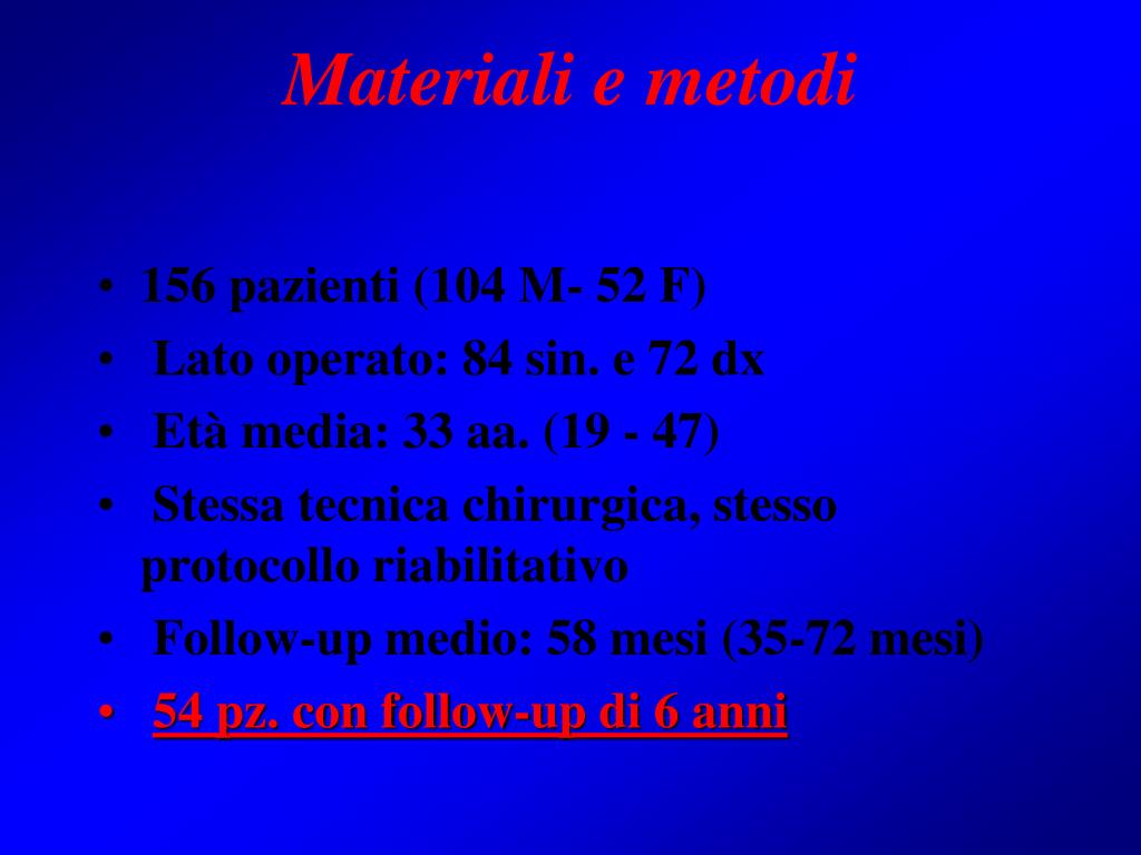 Materiali e metodi • 156 pazienti (104 M- 52 F) • Lato operato: 84 sin. e 72 dx • Età media: 33 aa. (19 - 47) • Stessa tecnica chirurgica, stesso protocollo riabilitativo • Follow-up medio: 58 mesi (35-72 mesi) • 54 pz. con follow-up di 6 anni