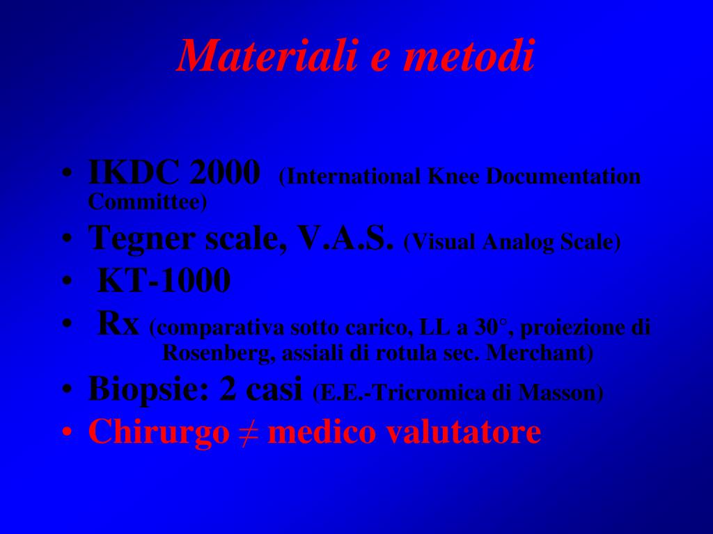 Materiali e metodi • IKDC 2000 (International Knee Documentation Committee) • Tegner scale, V.A.S. (Visual Analog Scale) • KT-1000 • Rx (comparativa sotto carico, LL a 30°, proiezione di Rosenberg, assiali di rotula sec. Merchant) • Biopsie: 2 casi (E.E.-Tricromica di Masson) • Chirurgo ≠ medico valutatore