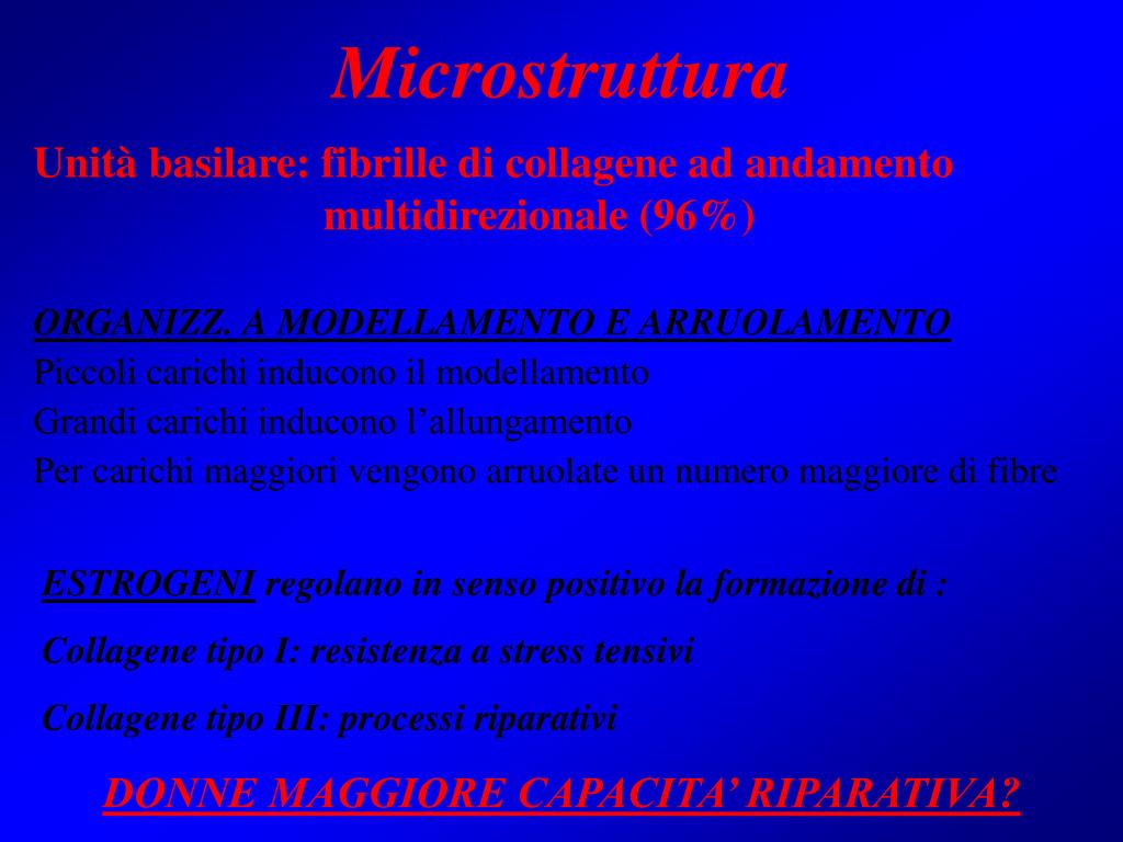 Microstruttura Unità basilare: fibrille di collagene ad andamento multidirezionale (96%) ORGANIZZ. A MODELLAMENTO E ARRUOLAMENTO Piccoli carichi inducono il modellamento Grandi carichi inducono l’allungamento Per carichi maggiori vengono arruolate un numero maggiore di fibre ESTROGENI regolano in senso positivo la formazione di : Collagene tipo I: resistenza a stress tensivi Collagene tipo III: processi riparativi DONNE MAGGIORE CAPACITA’ RIPARATIVA?
