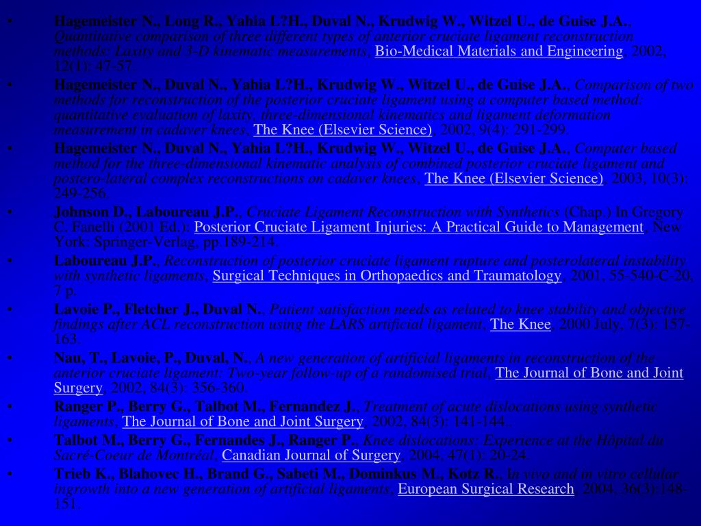 Hagemeister N., Long R., Yahia L?H., Duval N., Krudwig W., Witzel U., de Guise J.A., Quantitative comparison of three different types of anterior cruciate ligament reconstruction methods: Laxity and 3-D kinematic measurements, Bio-Medical Materials and Engineering, 2002, 12(1): 47-57. • Hagemeister N., Duval N., Yahia L?H., Krudwig W., Witzel U., de Guise J.A., Comparison of two methods for reconstruction of the posterior cruciate ligament using a computer based method: quantitative evaluation of laxity, three-dimensional kinematics and ligament deformation measurement in cadaver knees, The Knee (Elsevier Science), 2002, 9(4): 291-299. • Hagemeister N., Duval N., Yahia L?H., Krudwig W., Witzel U., de Guise J.A., Computer based method for the three-dimensional kinematic analysis of combined posterior cruciate ligament and postero-lateral complex reconstructions on cadaver knees, The Knee (Elsevier Science), 2003, 10(3): 249-256. • Johnson D., Laboureau J.P., Cruciate Ligament Reconstruction with Synthetics (Chap.) In Gregory C. Fanelli (2001 Ed.):Posterior Cruciate Ligament Injuries: A Practical Guide to Management, New York: Springer-Verlag, pp.189-214. • Laboureau J.P., Reconstruction of posterior cruciate ligament rupture and posterolateral instability with synthetic ligaments, Surgical Techniques in Orthopaedics and Traumatology, 2001, 55-540-C-20, 7 p. • Lavoie P., Fletcher J., Duval N., Patient satisfaction needs as related to knee stability and objective findings after ACL reconstruction using the LARS artificial ligament, The Knee, 2000 July, 7(3): 157-163. • Nau, T., Lavoie, P., Duval, N., A new generation of artificial ligaments in reconstruction of the anterior cruciate ligament: Two-year follow-up of a randomised trial, The Journal of Bone and Joint Surgery, 2002, 84(3): 356-360. • Ranger P., Berry G., Talbot M., Fernandez J., Treatment of acute dislocations using synthetic ligaments, The Journal of Bone and Joint Surgery, 2002, 84(3): 141-144.. • Talbot M., Berry G., Fernandes J., Ranger P., Knee dislocations: Experience at the Hôpital du Sacré-Coeur de Montréal, Canadian Journal of Surgery, 2004, 47(1): 20-24. • Trieb K., Blahovec H., Brand G., Sabeti M., Dominkus M., Kotz R., In vivo and in vitro cellular ingrowth into a new generation of artificial ligaments, European Surgical Research, 2004, 36(3):148-151.