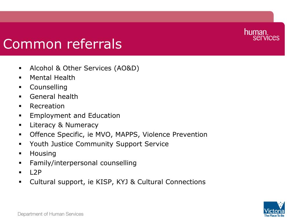 Common referrals • Alcohol & Other Services (AO&D) • Mental Health • Counselling • General health • Recreation • Employment and Education • Literacy & Numeracy • Offence Specific, ie MVO, MAPPS, Violence Prevention • Youth Justice Community Support Service • Housing • Family/interpersonal counselling • L2P • Cultural support, ie KISP, KYJ & Cultural Connections