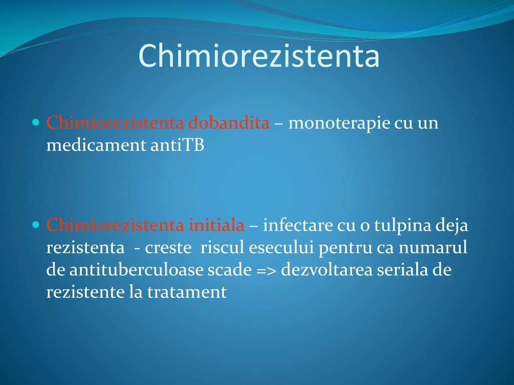 Chimiorezistenta • Chimiorezistenta dobandita – monoterapie cu un medicament antiTB • Chimiorezistenta initiala – infectare cu o tulpina deja rezistenta - creste riscul esecului pentru ca numarul de antituberculoase scade => dezvoltarea seriala de rezistente la tratament
