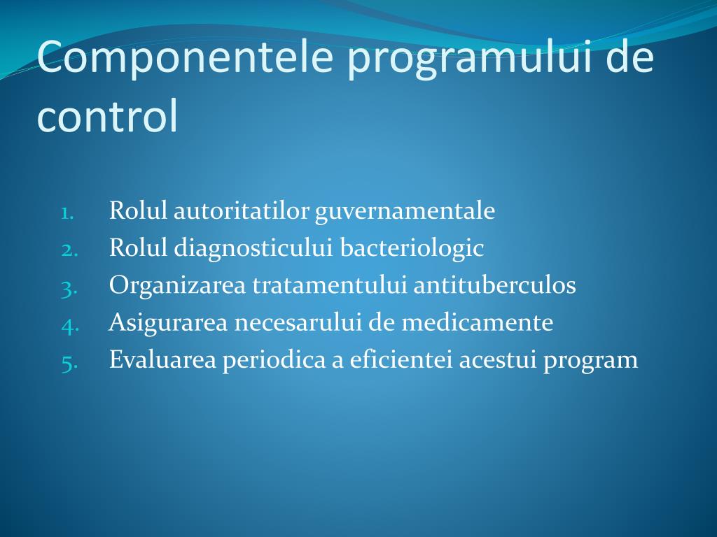 Componentele programului de control • Rolul autoritatilor guvernamentale • Rolul diagnosticului bacteriologic • Organizarea tratamentului antituberculos • Asigurarea necesarului de medicamente • Evaluarea periodica a eficientei acestui program