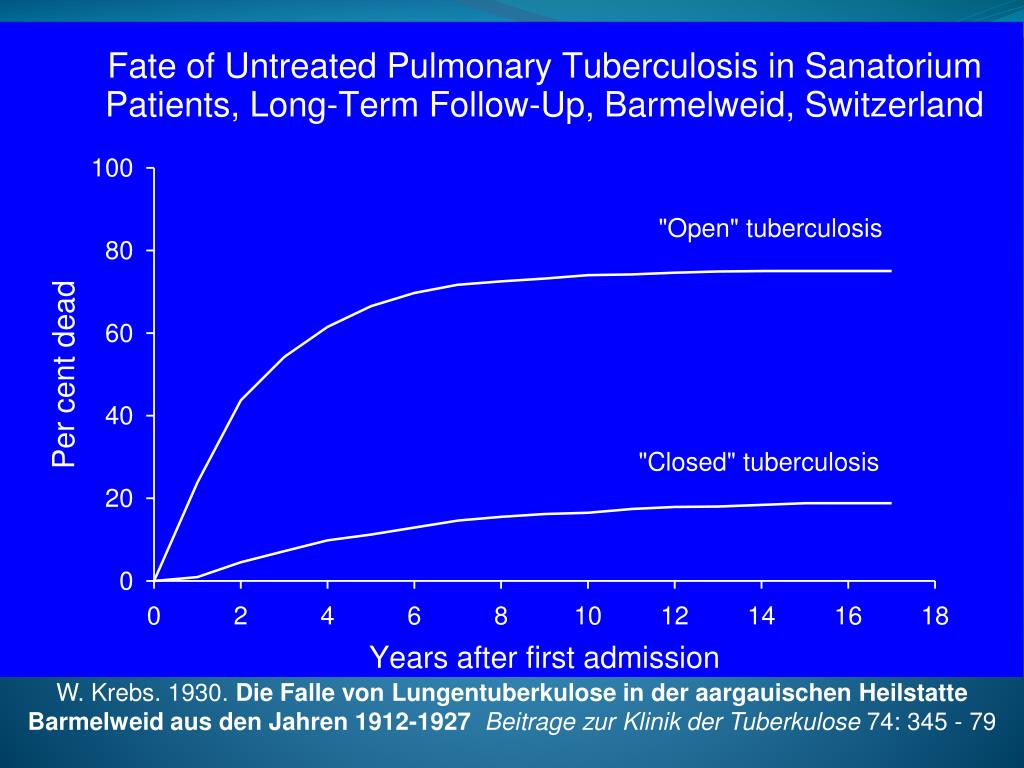 W. Krebs. 1930. Die Falle von Lungentuberkulose in der aargauischenHeilstatte Barmelweid aus den Jahren 1912-1927Beitrage zur Klinik der Tuberkulose 74: 345 - 79