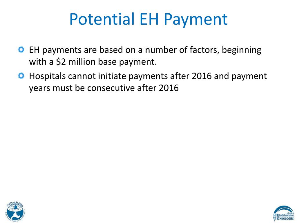Potential EH Payment EH payments are based on a number of factors, beginning with a $2 million base payment. Hospitals cannot initiate payments after 2016 and payment years must be consecutive after 2016