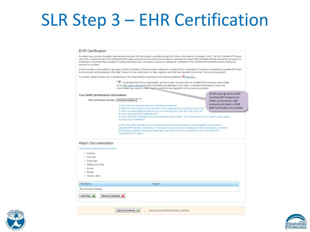 EHR Incentive Program Enrollment • To enroll in the incentive program EPs and EHs must: • Register at the CMS EHR Incentive Program Registration site • Register and attest at the Alaska Medicaid State Level Registry (SLR)