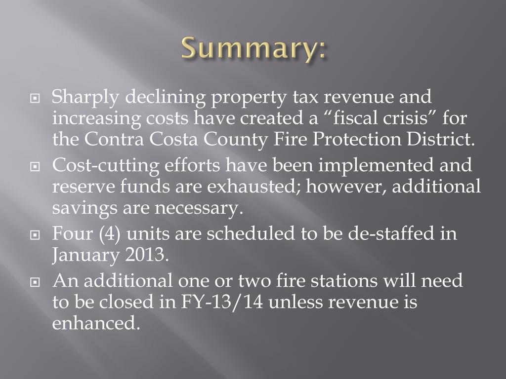 Summary: • Sharply declining property tax revenue and increasing costs have created a “fiscal crisis” for the Contra Costa County Fire Protection District. • Cost-cutting efforts have been implemented and reserve funds are exhausted; however, additional savings are necessary. • Four (4) units are scheduled to be de-staffed in January 2013. • An additional one or two fire stations will need to be closed in FY-13/14 unless revenue is enhanced.