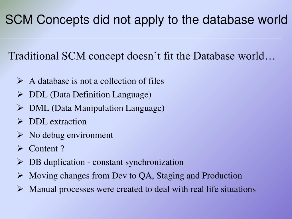 Traditional SCM concept doesn’t fit the Database world… A database is not a collection of files DDL (Data Definition Language) DML (Data Manipulation Language) DDL extraction No debug environment Content ? DB duplication - constant synchronization Moving changes from Dev to QA, Staging and Production Manual processes were created to deal with real life situations SCM Concepts did not apply to the database world
