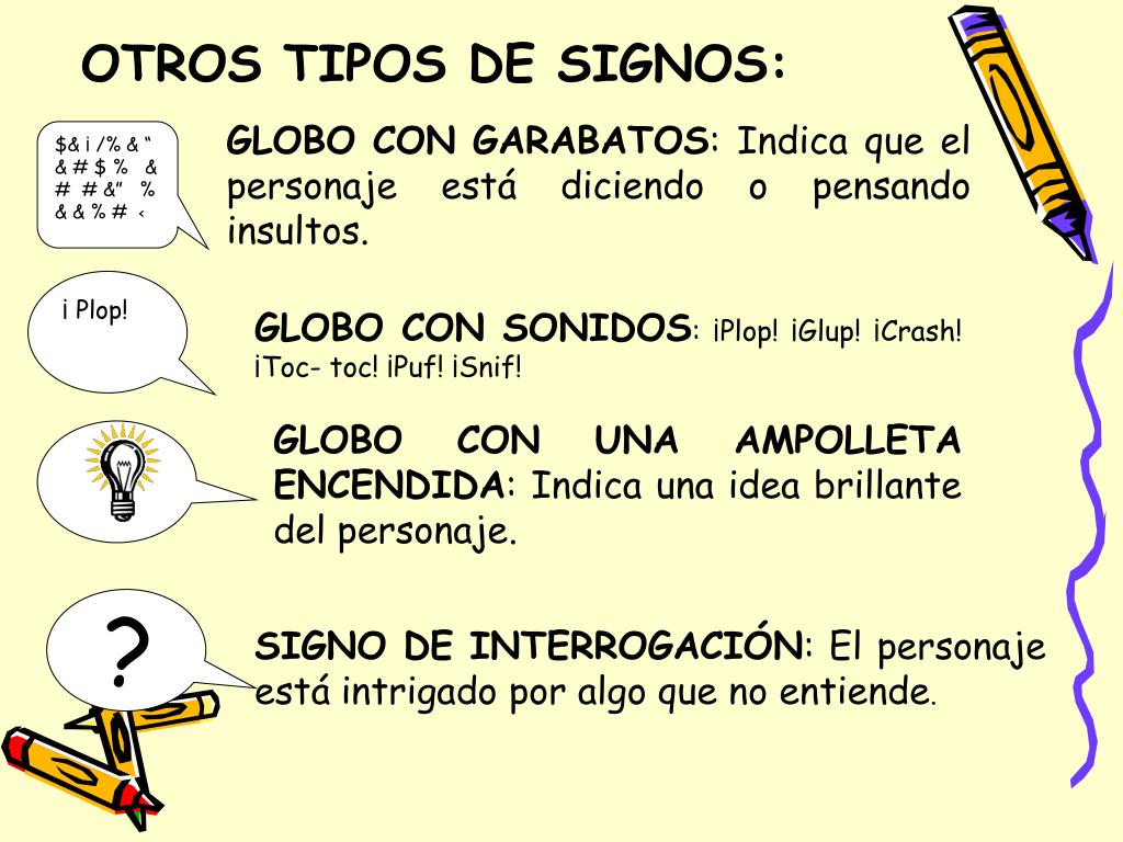 OTROS TIPOS DE SIGNOS: GLOBO CON GARABATOS: Indica que el personaje está diciendo o pensando insultos. $& ¡ /% & “ & # $ % & # # &” % & & % # < ¡ Plop! GLOBO CON SONIDOS: ¡Plop! ¡Glup! ¡Crash! ¡Toc- toc! ¡Puf! ¡Snif! GLOBO CON UNA AMPOLLETA ENCENDIDA: Indica una idea brillante del personaje. ? SIGNO DE INTERROGACIÓN: El personaje está intrigado por algo que no entiende.