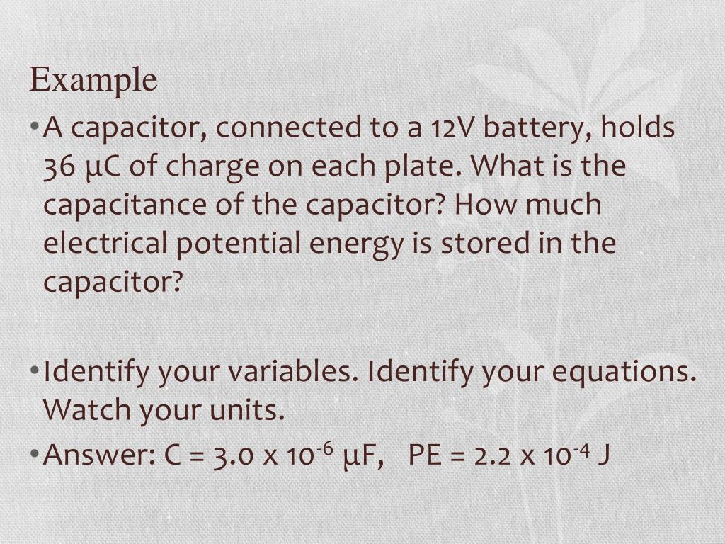 Example • A capacitor, connected to a 12V battery, holds 36 μC of charge on each plate. What is the capacitance of the capacitor? How much electrical potential energy is stored in the capacitor? • Identify your variables. Identify your equations. Watch your units. • Answer: C = 3.0 x 10-6μF, PE = 2.2 x 10-4 J