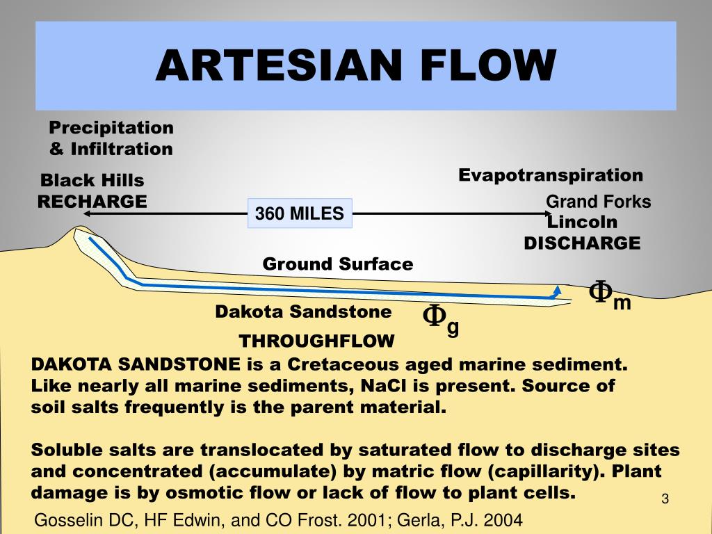 ARTESIAN FLOW Precipitation & Infiltration Evapotranspiration Black Hills RECHARGE Grand Forks 360 MILES Lincoln DISCHARGE Ground Surface Fm Fg Dakota Sandstone THROUGHFLOW DAKOTA SANDSTONE is a Cretaceous aged marine sediment. Like nearly all marine sediments, NaCl is present. Source of soil salts frequently is the parent material. Soluble salts are translocated by saturated flow to discharge sites and concentrated (accumulate) by matric flow (capillarity). Plant damage is by osmotic flow or lack of flow to plant cells. Gosselin DC, HF Edwin, and CO Frost. 2001; Gerla, P.J. 2004