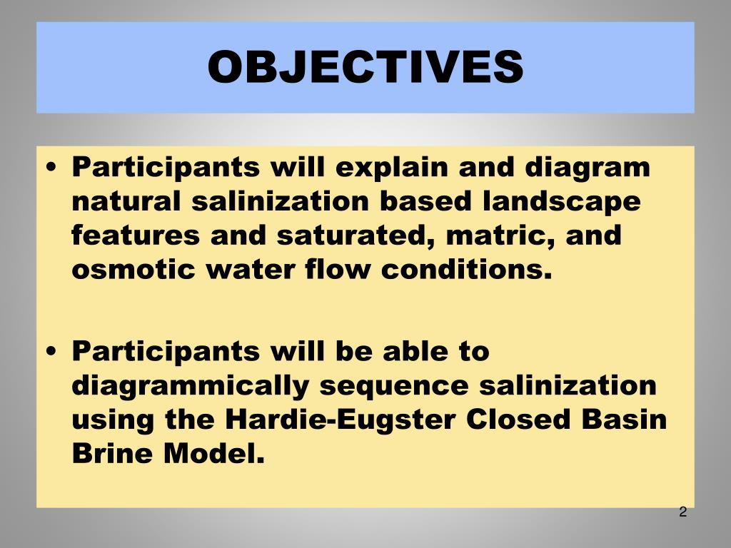 OBJECTIVES • Participants will explain and diagram natural salinization based landscape features and saturated, matric, and osmotic water flow conditions. • Participants will be able to diagrammically sequence salinization using the Hardie-Eugster Closed Basin Brine Model.