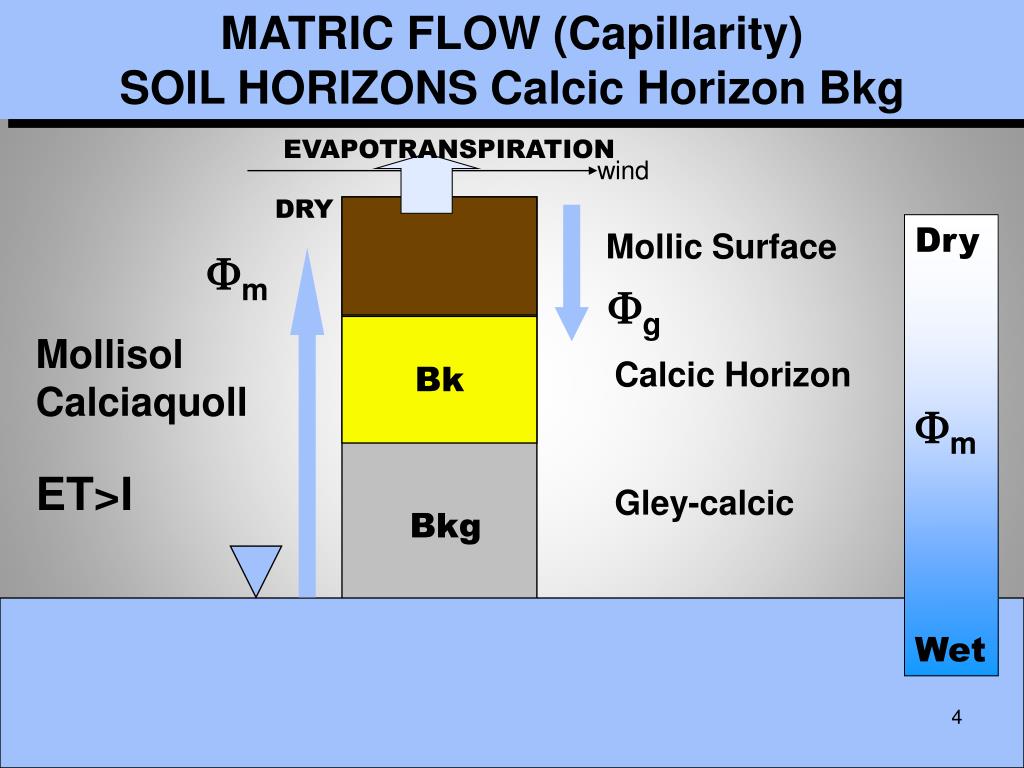 MATRIC FLOW (Capillarity)SOIL HORIZONS Calcic Horizon Bkg EVAPOTRANSPIRATION wind DRY Dry Wet Mollic Surface Fm Fg Bk Mollisol Calciaquoll ET>I Calcic Horizon Fm Gley-calcic Bkg