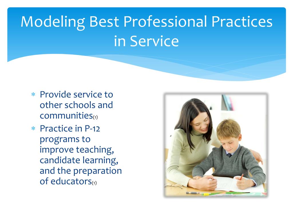 Modeling Best Professional Practices in Service • Provide service to other schools and communities(1) • Practice in P-12 programs to improve teaching, candidate learning, and the preparation of educators(1)