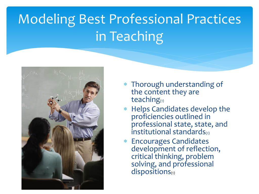Modeling Best Professional Practices in Teaching • Thorough understanding of the content they are teaching(1) • Helps Candidates develop the proficiencies outlined in professional state, state, and institutional standards(1) • Encourages Candidates development of reflection, critical thinking, problem solving, and professional dispositions(1)