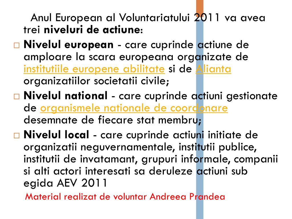 Anul European al Voluntariatului 2011 va avea trei niveluri de actiune: • Nivelul european - care cuprinde actiune de amploare la scara europeana organizate de institutiile europene abilitate si de Alianta organizatiilor societatii civile; • Nivelul national - care cuprinde actiuni gestionate de organismele nationale de coordonare desemnate de fiecare stat membru; • Nivelul local - care cuprinde actiuni initiate de organizatii neguvernamentale, institutii publice, institutii de invatamant, grupuri informale, companii si alti actori interesati sa deruleze actiuni sub egida AEV 2011 Material realizat de voluntar Andreea Prandea