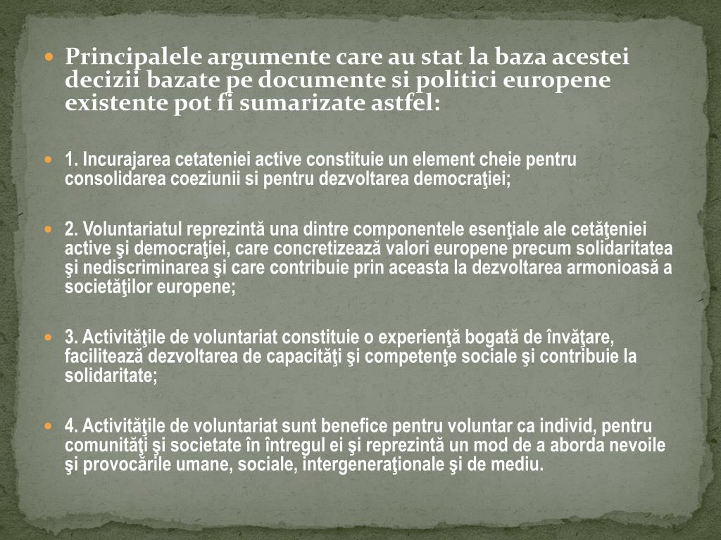Principalele argumente care au stat la baza acestei decizii bazate pe documente si politici europene existente pot fi sumarizate astfel: • 1. Incurajarea cetateniei active constituie un element cheie pentru consolidarea coeziunii si pentru dezvoltarea democraţiei; • 2. Voluntariatul reprezintă una dintre componentele esenţiale ale cetăţeniei active şi democraţiei, care concretizează valori europene precum solidaritatea şi nediscriminarea şi care contribuie prin aceasta la dezvoltarea armonioasă a societăţilor europene; • 3. Activităţile de voluntariat constituie o experienţă bogată de învăţare, facilitează dezvoltarea de capacităţi şi competenţe sociale şi contribuie la solidaritate; • 4. Activităţile de voluntariat sunt benefice pentru voluntar ca individ, pentru comunităţi şi societate în întregul ei şi reprezintă un mod de a aborda nevoile şi provocările umane, sociale, intergeneraţionale şi de mediu.