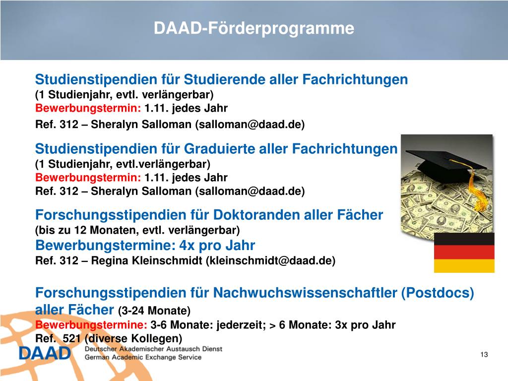 DAAD-Förderprogramme Studienstipendien für Studierende aller Fachrichtungen (1 Studienjahr, evtl. verlängerbar)Bewerbungstermin: 1.11. jedes JahrRef. 312 – Sheralyn Salloman (salloman@daad.de) Studienstipendien für Graduierte aller Fachrichtungen(1 Studienjahr, evtl.verlängerbar)Bewerbungstermin:1.11. jedes JahrRef. 312 – Sheralyn Salloman (salloman@daad.de) Forschungsstipendien für Doktoranden aller Fächer(bis zu 12 Monaten, evtl. verlängerbar)Bewerbungstermine: 4x pro JahrRef. 312 – Regina Kleinschmidt (kleinschmidt@daad.de)Forschungsstipendien für Nachwuchswissenschaftler (Postdocs)aller Fächer (3-24 Monate)Bewerbungstermine: 3-6 Monate: jederzeit; > 6 Monate: 3x pro Jahr Ref. 521 (diverse Kollegen)