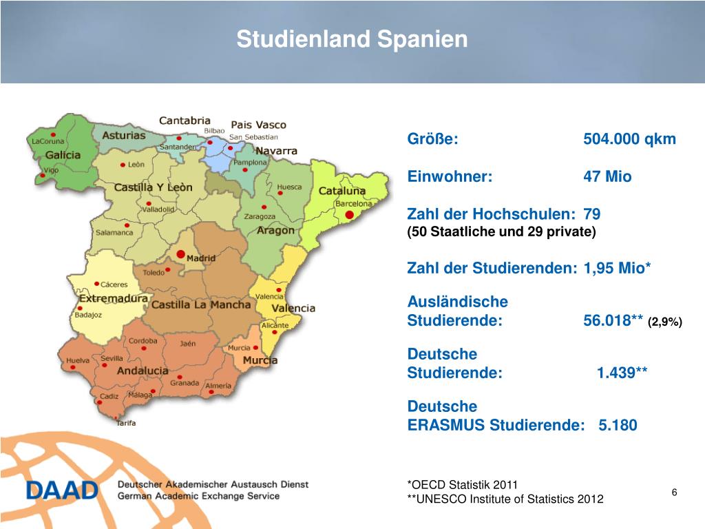 Studienland Spanien Größe: 504.000 qkmEinwohner: 47 MioZahl der Hochschulen: 79 (50 Staatliche und 29 private)Zahl der Studierenden: 1,95 Mio* Ausländische Studierende: 56.018** (2,9%) Deutsche Studierende: 1.439** Deutsche ERASMUS Studierende: 5.180 *OECD Statistik 2011 **UNESCO Institute of Statistics 2012