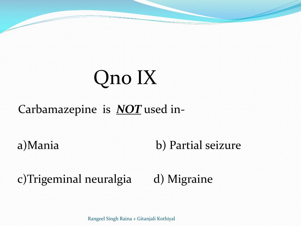 Qno IX Carbamazepine is NOT used in- a)Mania b) Partial seizure c)Trigeminal neuralgia d) Migraine Rangeel Singh Raina + Gitanjali Kothiyal