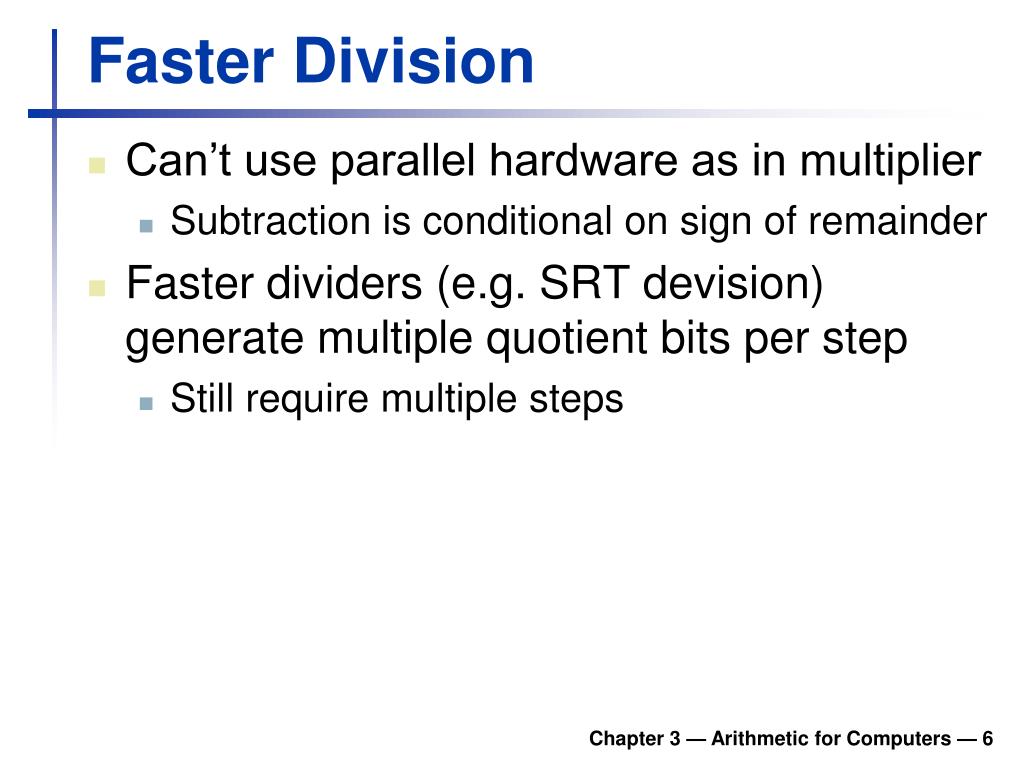 Optimized Divider • One cycle per partial-remainder subtraction • Looks a lot like a multiplier! • Same hardware can be used for both Chapter 3 — Arithmetic for Computers — 5
