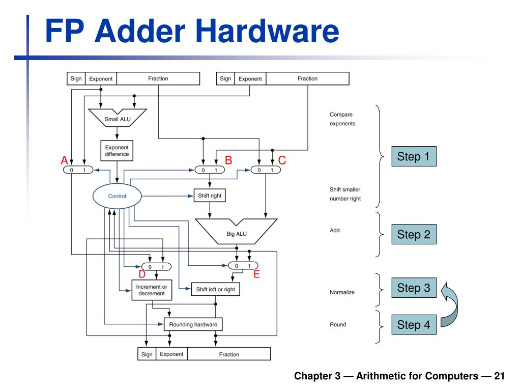 FP Adder Hardware Step 1 A B C Step 2 D E Step 3 Step 4 Chapter 3 — Arithmetic for Computers — 21