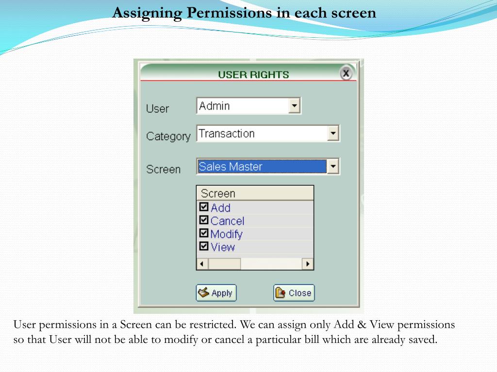 Assigning Permissions in each screen User permissions in a Screen can be restricted. We can assign only Add & View permissions so that User will not be able to modify or cancel a particular bill which are already saved.