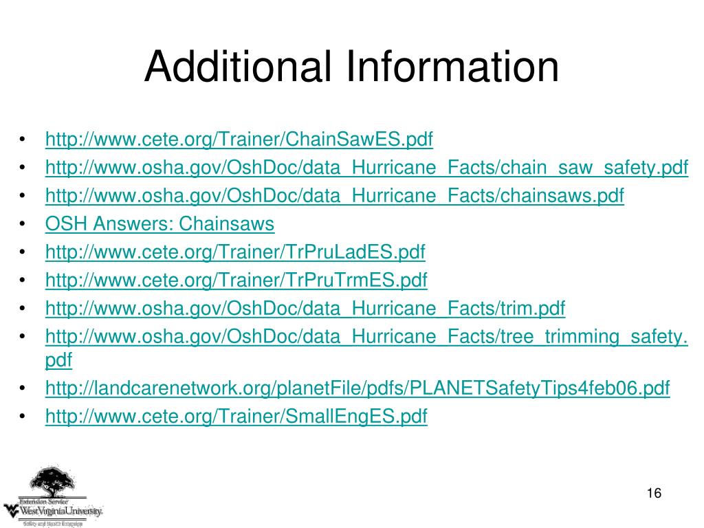 Additional Information • http://www.cete.org/Trainer/ChainSawES.pdf • http://www.osha.gov/OshDoc/data_Hurricane_Facts/chain_saw_safety.pdf • http://www.osha.gov/OshDoc/data_Hurricane_Facts/chainsaws.pdf • OSH Answers: Chainsaws • http://www.cete.org/Trainer/TrPruLadES.pdf • http://www.cete.org/Trainer/TrPruTrmES.pdf • http://www.osha.gov/OshDoc/data_Hurricane_Facts/trim.pdf • http://www.osha.gov/OshDoc/data_Hurricane_Facts/tree_trimming_safety.pdf • http://landcarenetwork.org/planetFile/pdfs/PLANETSafetyTips4feb06.pdf • http://www.cete.org/Trainer/SmallEngES.pdf