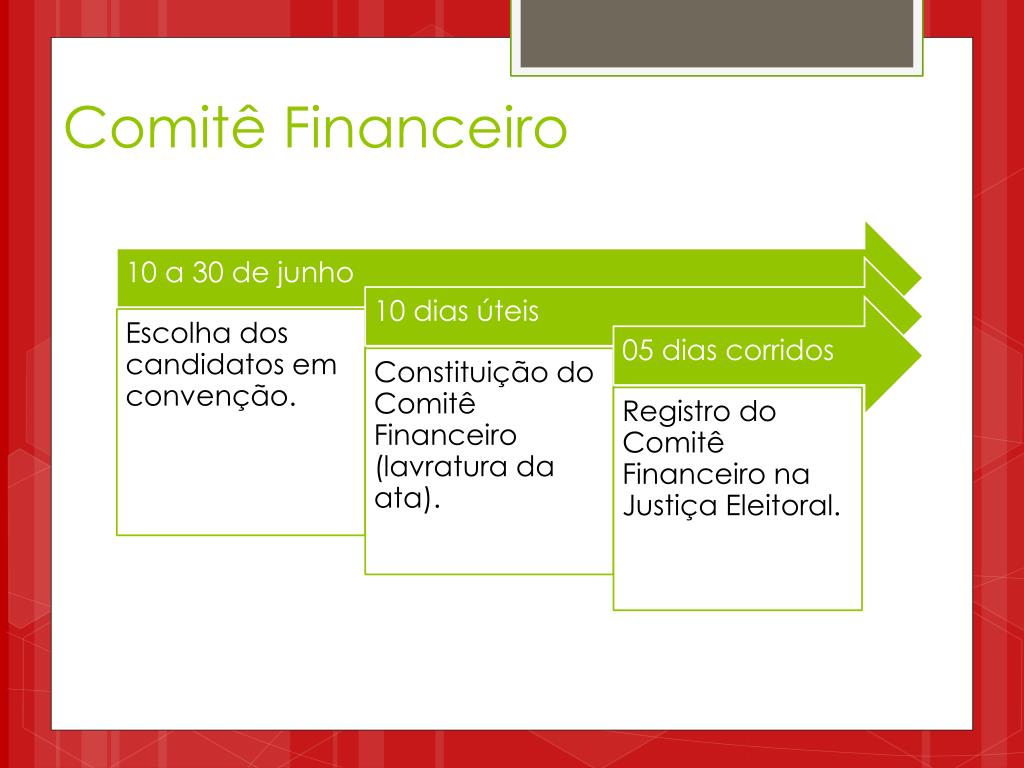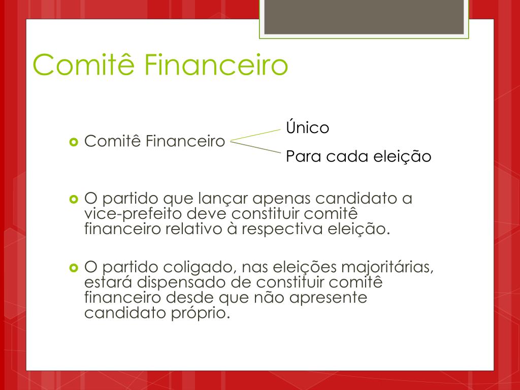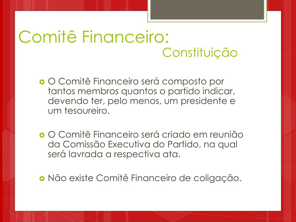 Comitê Financeiro: Constituição • O Comitê Financeiro será composto por tantos membros quantos o partido indicar, devendo ter, pelo menos, um presidente e um tesoureiro. • O Comitê Financeiro será criado em reunião da Comissão Executiva do Partido, na qual será lavrada a respectiva ata. • Não existe Comitê Financeiro de coligação.