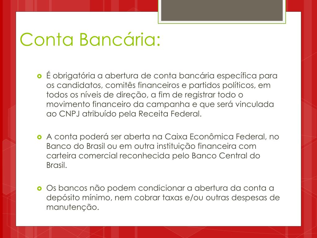 Conta Bancária: • É obrigatória a abertura de conta bancária específica para os candidatos, comitês financeiros e partidos políticos, em todos os níveis de direção, a fim de registrar todo o movimento financeiro da campanha e que será vinculada ao CNPJ atribuído pela Receita Federal. • A conta poderá ser aberta na Caixa Econômica Federal, no Banco do Brasil ou em outra instituição financeira com carteira comercial reconhecida pelo Banco Central do Brasil. • Os bancos não podem condicionar a abertura da conta a depósito mínimo, nem cobrar taxas e/ou outras despesas de manutenção.