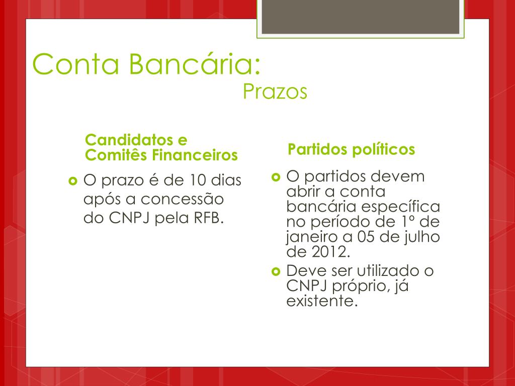 Conta Bancária: Prazos Candidatos e Comitês Financeiros Partidos políticos O partidos devem abrir a conta bancária específica no período de 1º de janeiro a 05 de julho de 2012. Deve ser utilizado o CNPJ próprio, já existente. • O prazo é de 10 dias após a concessão do CNPJ pela RFB.