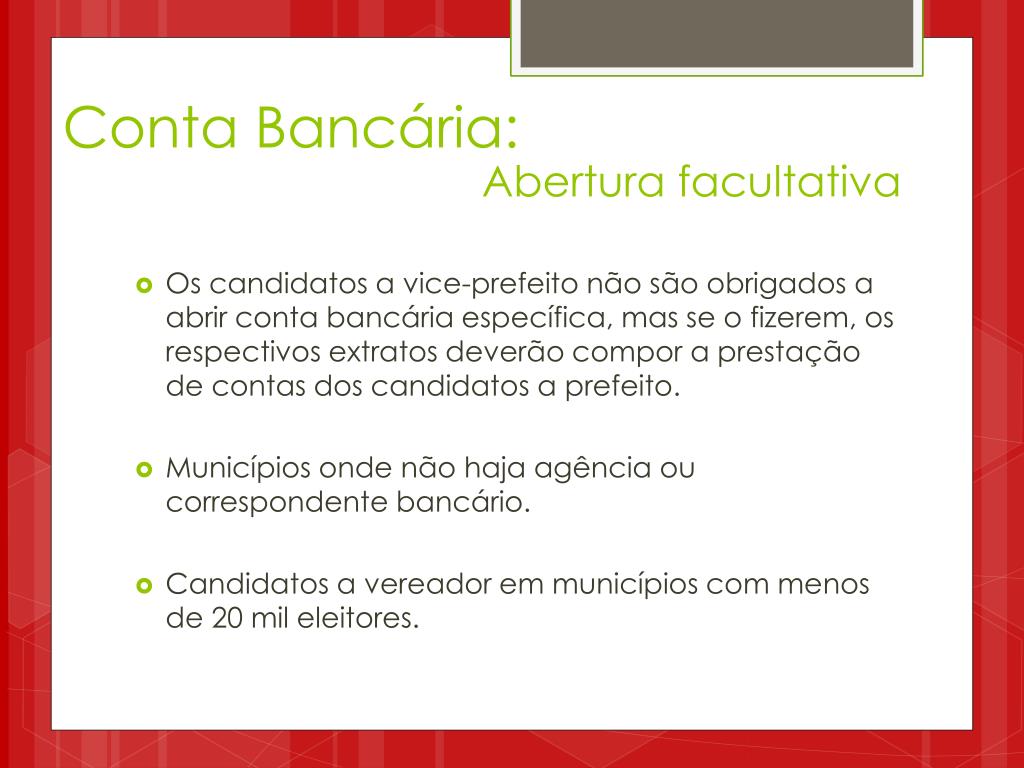 Conta Bancária: Abertura facultativa • Os candidatos a vice-prefeito não são obrigados a abrir conta bancária específica, mas se o fizerem, os respectivos extratos deverão compor a prestação de contas dos candidatos a prefeito. • Municípios onde não haja agência ou correspondente bancário. • Candidatos a vereador em municípios com menos de 20 mil eleitores.