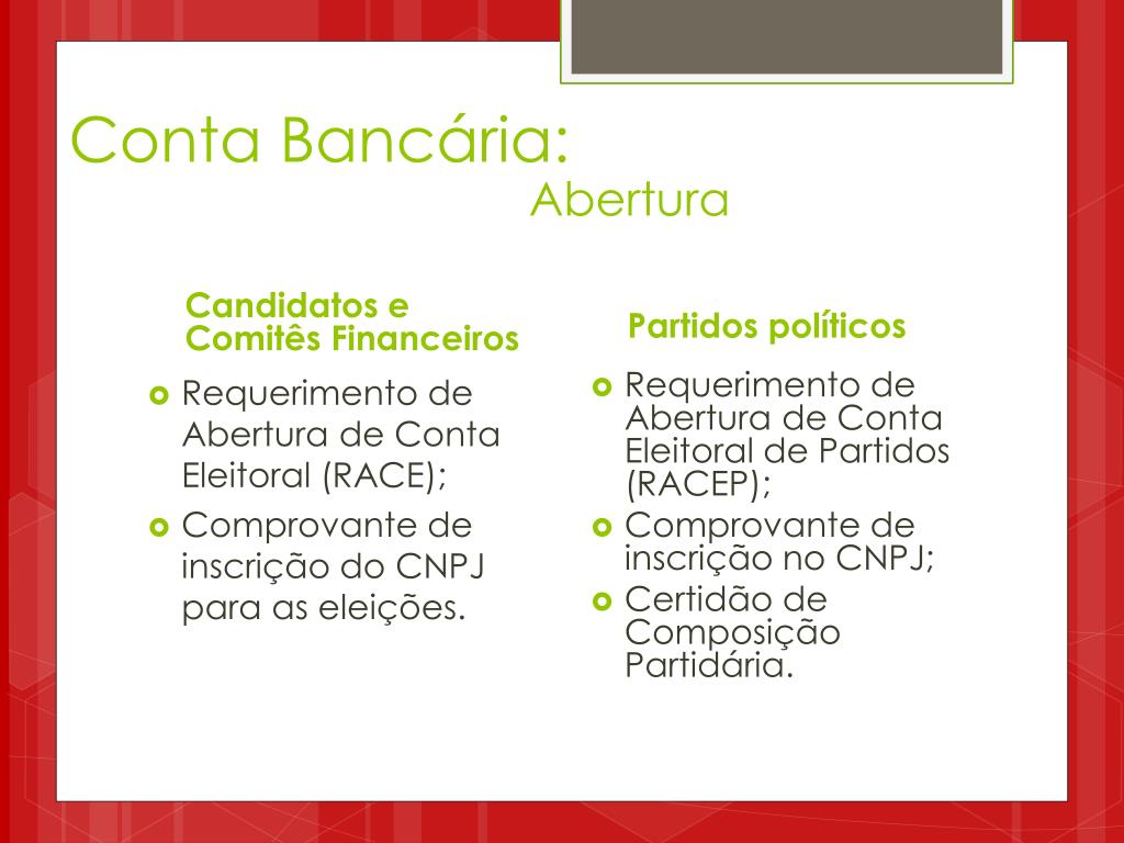 Conta Bancária: Abertura Candidatos e Comitês Financeiros Partidos políticos Requerimento de Abertura de Conta Eleitoral de Partidos (RACEP); Comprovante de inscrição no CNPJ; Certidão de Composição Partidária. • Requerimento de Abertura de Conta Eleitoral (RACE); • Comprovante de inscrição do CNPJ para as eleições.