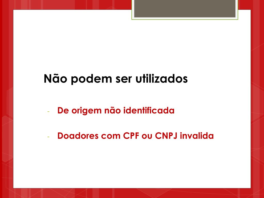 Não podem ser utilizados De origem não identificada Doadores com CPF ou CNPJ invalida