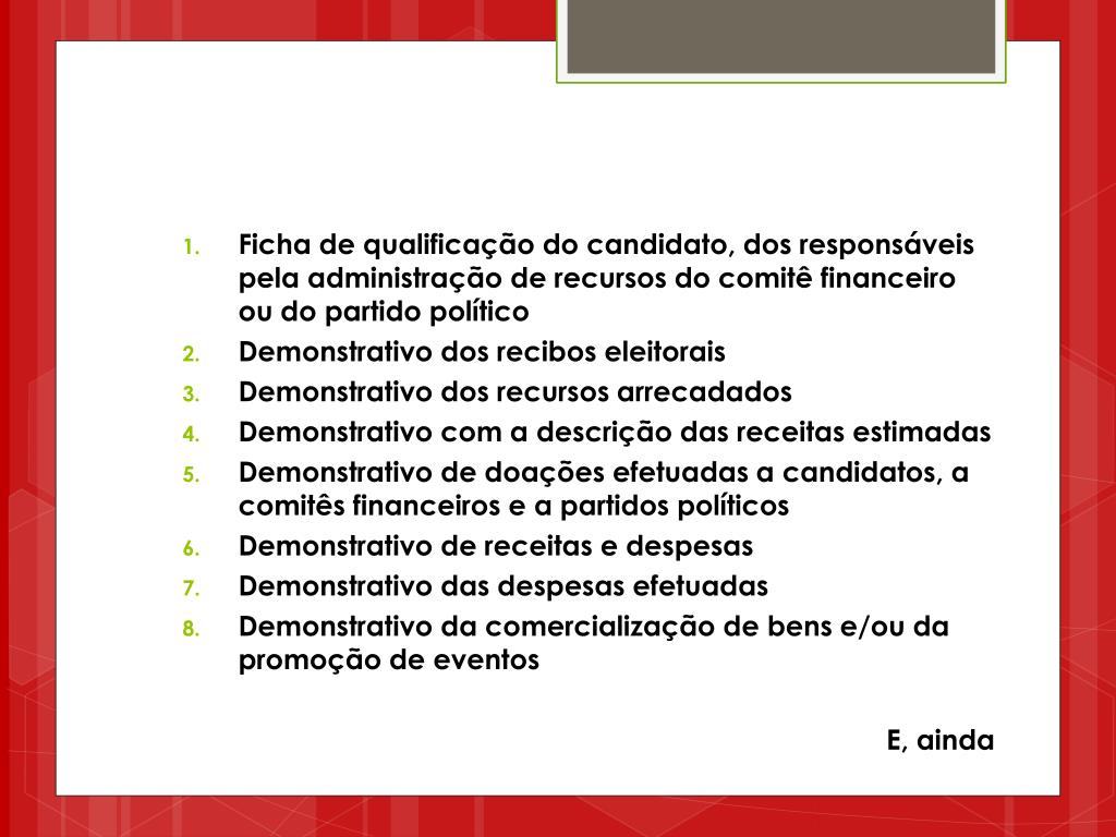 Ficha de qualificação do candidato, dos responsáveis pela administração de recursos do comitê financeiro ou do partido político Demonstrativo dos recibos eleitorais Demonstrativo dos recursos arrecadados Demonstrativo com a descrição das receitas estimadas Demonstrativo de doações efetuadas a candidatos, a comitês financeiros e a partidos políticos Demonstrativo de receitas e despesas Demonstrativo das despesas efetuadas Demonstrativo da comercialização de bens e/ou da promoção de eventos E, ainda