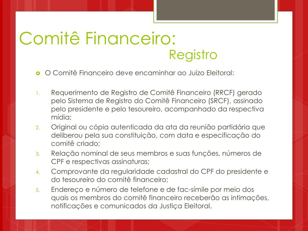 Comitê Financeiro: Registro • O Comitê Financeiro deve encaminhar ao Juízo Eleitoral: • Requerimento de Registro de Comitê Financeiro (RRCF) gerado pelo Sistema de Registro do Comitê Financeiro (SRCF), assinado pelo presidente e pelo tesoureiro, acompanhado da respectiva mídia; • Original ou cópia autenticada da ata da reunião partidária que deliberou pela sua constituição, com data e especificação do comitê criado; • Relação nominal de seus membros e suas funções, números de CPF e respectivas assinaturas; • Comprovante da regularidade cadastral do CPF do presidente e do tesoureiro do comitê financeiro; • Endereço e número de telefone e de fac-símile por meio dos quais os membros do comitê financeiro receberão as intimações, notificações e comunicados da Justiça Eleitoral.