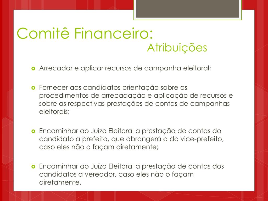 Comitê Financeiro: Atribuições • Arrecadar e aplicar recursos de campanha eleitoral; • Fornecer aos candidatos orientação sobre os procedimentos de arrecadação e aplicação de recursos e sobre as respectivas prestações de contas de campanhas eleitorais; • Encaminhar ao Juízo Eleitoral a prestação de contas do candidato a prefeito, que abrangerá a do vice-prefeito, caso eles não o façam diretamente; • Encaminhar ao Juízo Eleitoral a prestação de contas dos candidatos a vereador, caso eles não o façam diretamente.