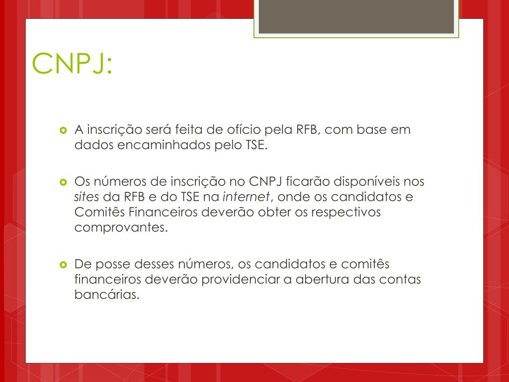 CNPJ: • A inscrição será feita de ofício pela RFB, com base em dados encaminhados pelo TSE. • Os números de inscrição no CNPJ ficarão disponíveis nos sites da RFB e do TSE na internet, onde os candidatos e Comitês Financeiros deverão obter os respectivos comprovantes. • De posse desses números, os candidatos e comitês financeiros deverão providenciar a abertura das contas bancárias.
