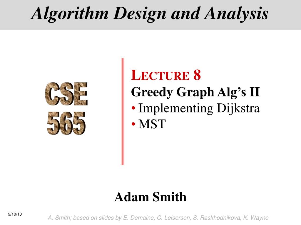 LECTURE 8 • Greedy Graph Alg’s II • Implementing Dijkstra • MST Algorithm Design and Analysis CSE 565 Adam Smith A. Smith; based on slides by E. Demaine, C. Leiserson, S. Raskhodnikova, K. Wayne