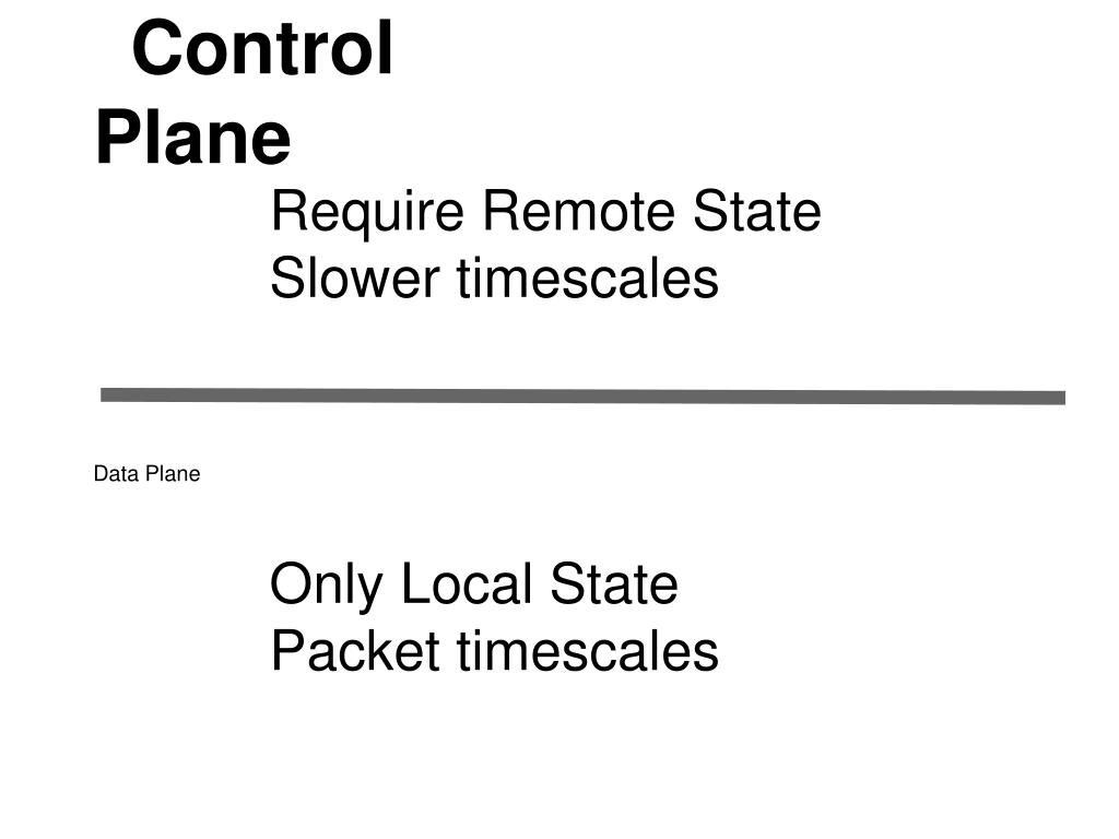 Data Plane • Require Remote State • Slower timescales Control Plane • Only Local State • Packet timescales