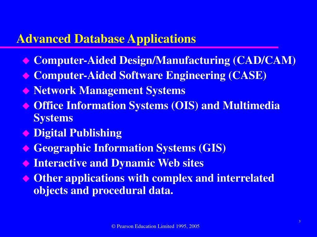 Advanced Database Applications • Computer-Aided Design/Manufacturing (CAD/CAM) • Computer-Aided Software Engineering (CASE) • Network Management Systems • Office Information Systems (OIS) and Multimedia Systems • Digital Publishing • Geographic Information Systems (GIS) • Interactive and Dynamic Web sites • Other applications with complex and interrelated objects and procedural data. © Pearson Education Limited 1995, 2005