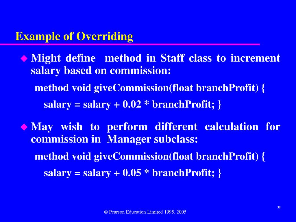 Example of Overriding • Might define method in Staff class to increment salary based on commission: method void giveCommission(float branchProfit) { salary = salary + 0.02 * branchProfit; } • May wish to perform different calculation for commission in Manager subclass: method void giveCommission(float branchProfit) { salary = salary + 0.05 * branchProfit; } © Pearson Education Limited 1995, 2005