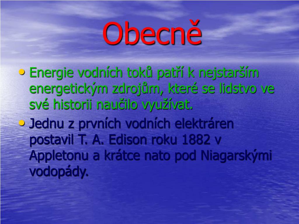 Obecně • Energie vodních toků patří k nejstarším energetickým zdrojům, které se lidstvo ve své historii naučilo využívat. • Jednu z prvních vodních elektráren postavil T. A. Edison roku 1882 v Appletonu a krátce nato pod Niagarskými vodopády.