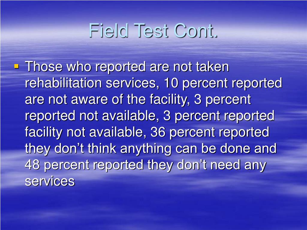 Field Test Cont. • Those who reported are not taken rehabilitation services, 10 percent reported are not aware of the facility, 3 percent reported not available, 3 percent reported facility not available, 36 percent reported they don’t think anything can be done and 48 percent reported they don’t need any services