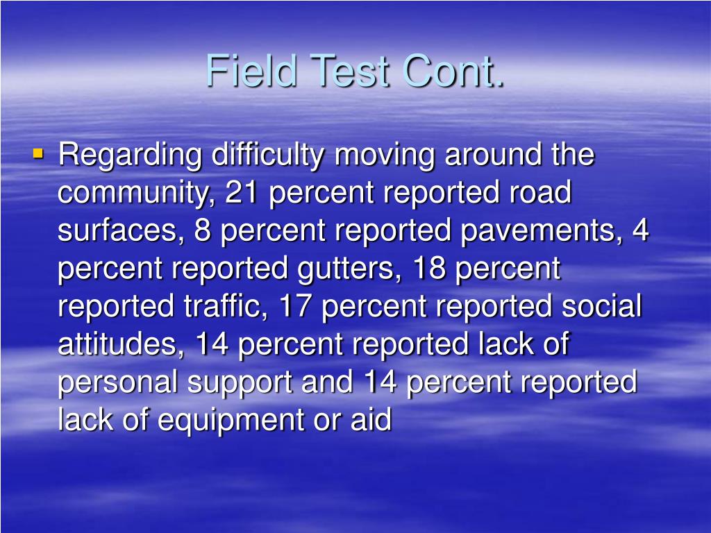 Field Test Cont. • Regarding difficulty moving around the community, 21 percent reported road surfaces, 8 percent reported pavements, 4 percent reported gutters, 18 percent reported traffic, 17 percent reported social attitudes, 14 percent reported lack of personal support and 14 percent reported lack of equipment or aid