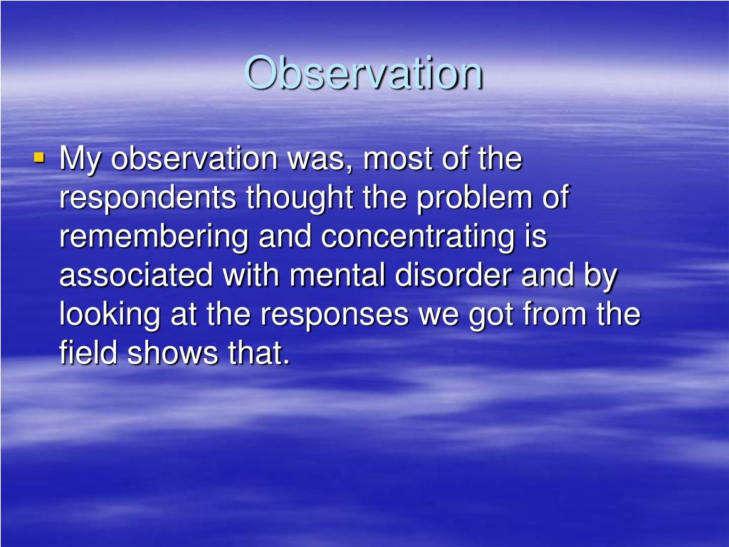 Observation • My observation was, most of the respondents thought the problem of remembering and concentrating is associated with mental disorder and by looking at the responses we got from the field shows that.