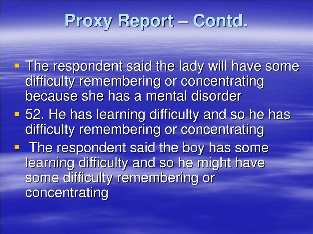Proxy Report – Contd. • The respondent said the lady will have some difficulty remembering or concentrating because she has a mental disorder • 52. He has learning difficulty and so he has difficulty remembering or concentrating • The respondent said the boy has some learning difficulty and so he might have some difficulty remembering or concentrating