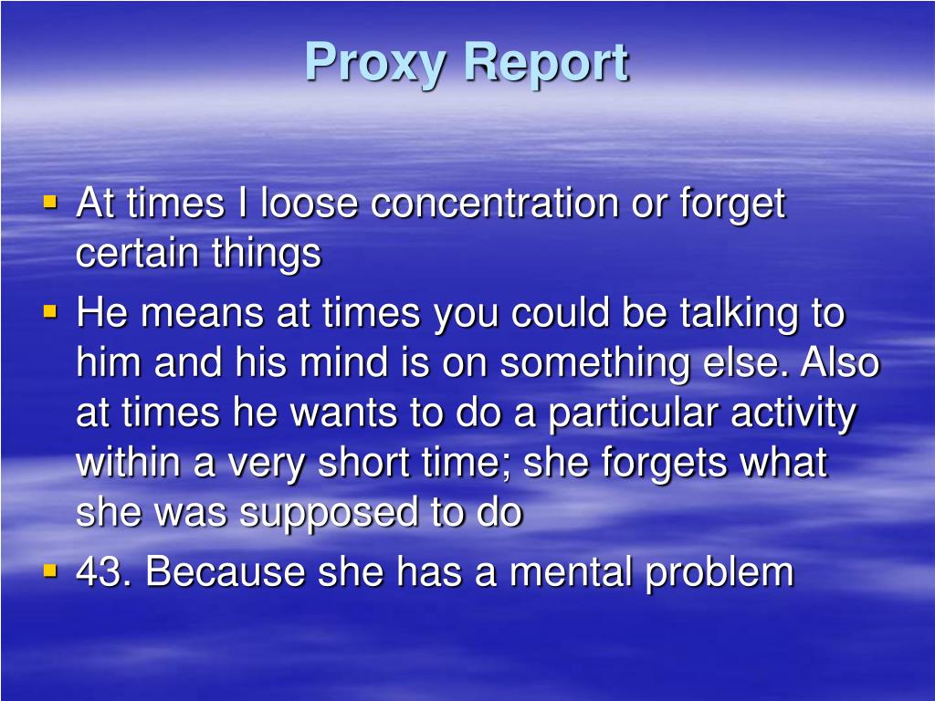 Proxy Report • At times I loose concentration or forget certain things • He means at times you could be talking to him and his mind is on something else. Also at times he wants to do a particular activity within a very short time; she forgets what she was supposed to do • 43. Because she has a mental problem