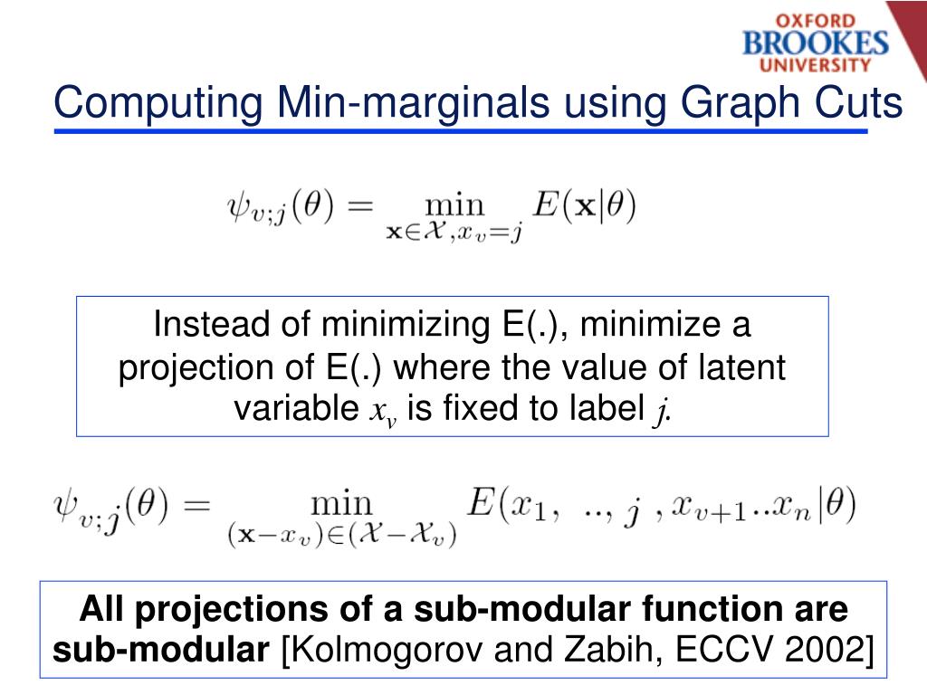 Computing Min-marginals using Graph Cuts Instead of minimizing E(.), minimize a projection of E(.) where the value of latent variable xv is fixed to label j. All projections of a sub-modular function are sub-modular [Kolmogorov and Zabih, ECCV 2002]