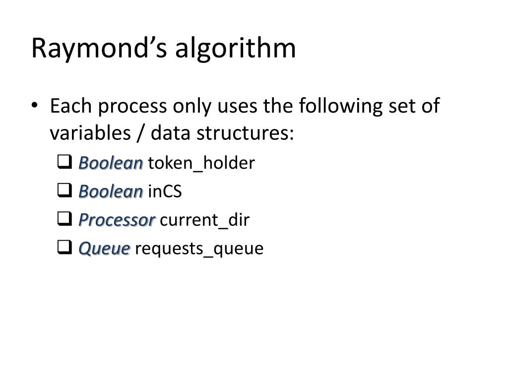 Raymond’s algorithm Request_CS: • If not token_holder • if requests_queue.isEmpty( ) • send(current_dir, REQUEST) • requests_queue.enqueue(self) • wait until token_holder is true • inCS:= true Release_CS: • inCS:= false • If not requests_queue.isEmpty( ) • current_dir:= requests_queue.dequeue( ) • send(current_dir, TOKEN) • token_holder:= false • if not requests_queue.isEmpty( ) • send(current_dir, REQUEST)